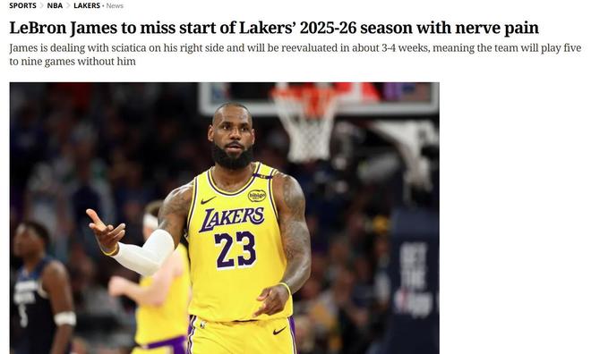 在季前赛火热进行之际,ESPN名记Shams曝出湖人锋线核心詹姆斯遭遇右侧坐骨神经痛,不仅将缺席新赛季揭幕战,更是至少将在新赛季初期缺阵3-4周时间。